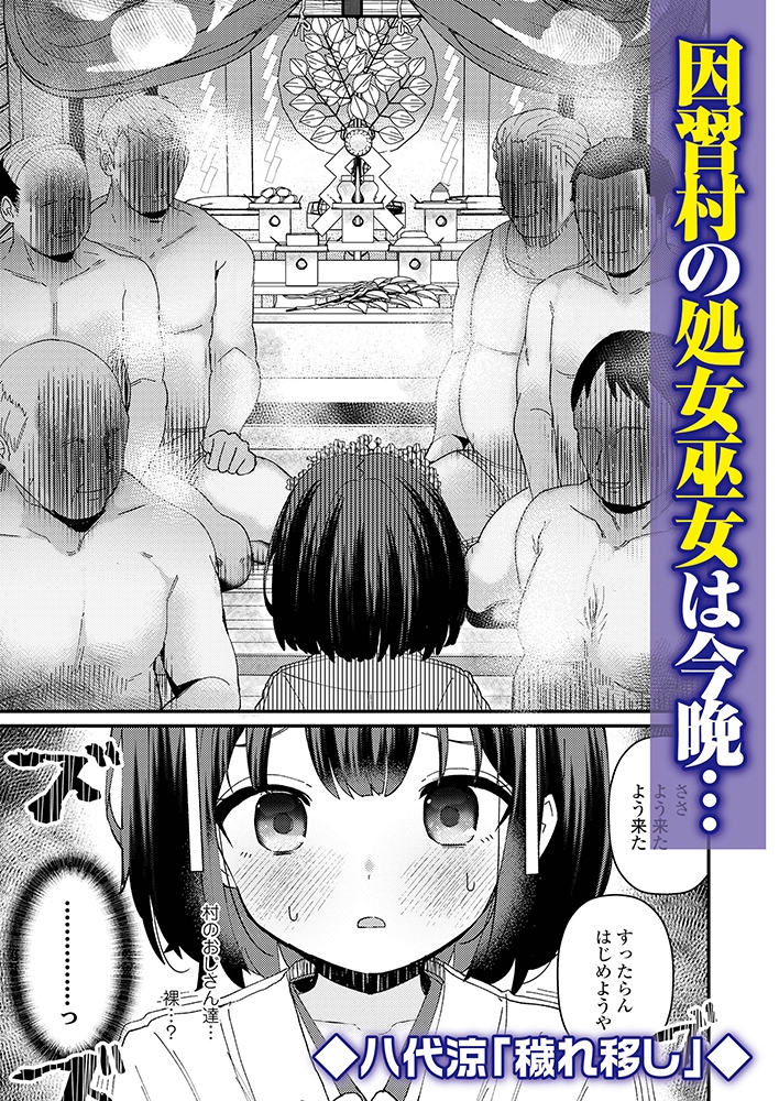 ◆今の凌○漫画には欠かせない「因習村」「処女巫女」もあります!八代涼先生の描く黒髪おかっぱの無垢な美少女巫女が呼ばれた座敷には裸の男たちと幼馴染の少年が…そして始まる穢れの儀式!